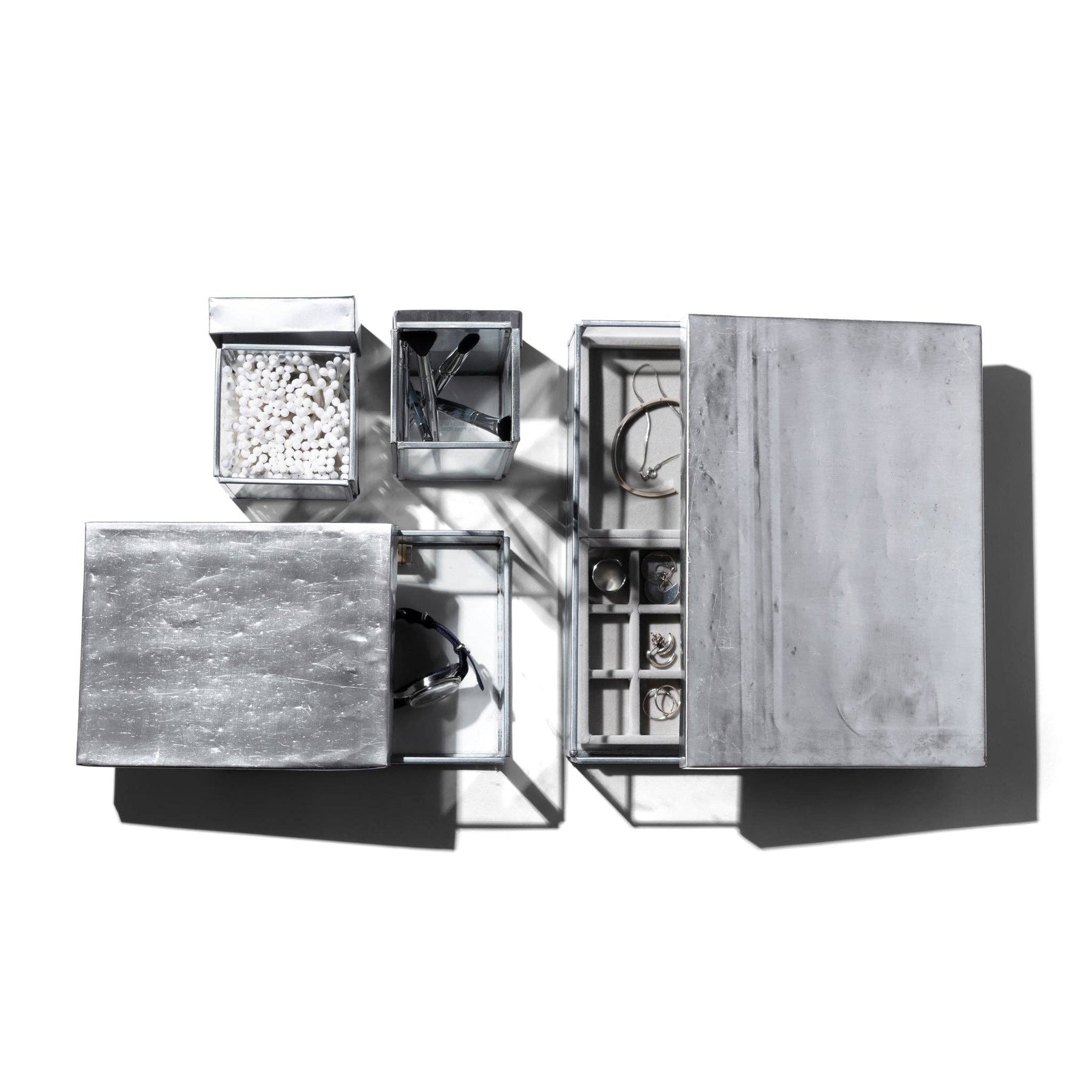 This versatile tray is ideal for holding jewelry, loose change, keys, or other small essentials. Made from recycled steel with a heavy glass lid, each piece features unique variations from the upcycled materials used in production.